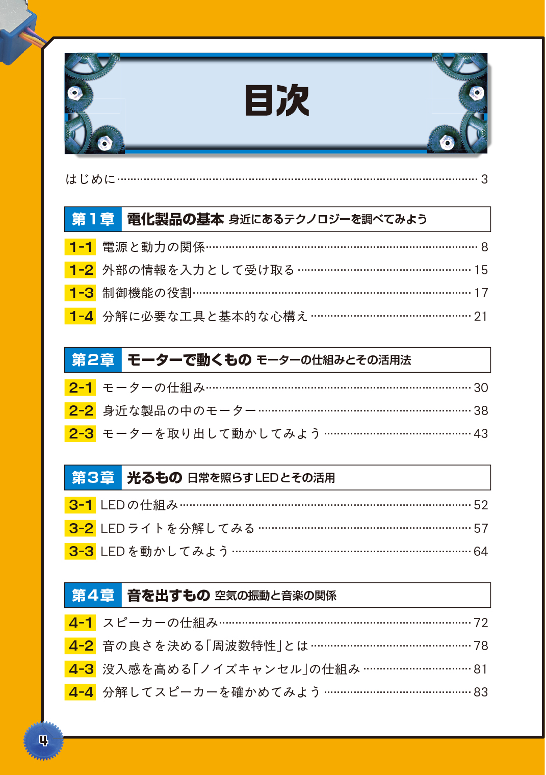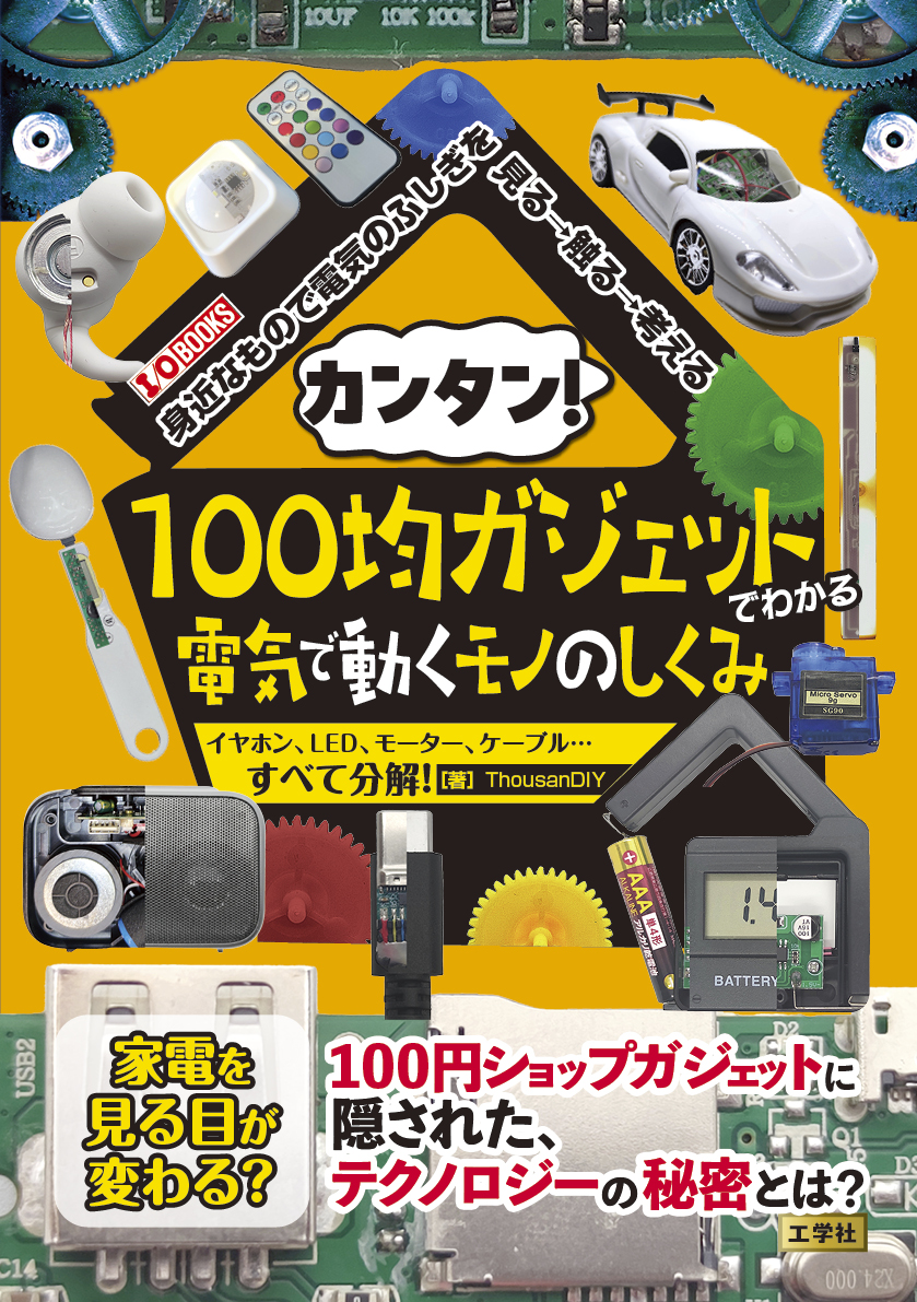 身近な100円ショップの製品で「電気が動く・光る・音を出す・はかる」仕組みを学べる! モーター、LED、スピーカー、USBケーブル、センサーなどを実際に分解し、内部の構造や原理をわかりやすく解説。