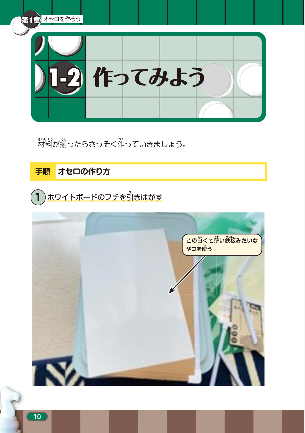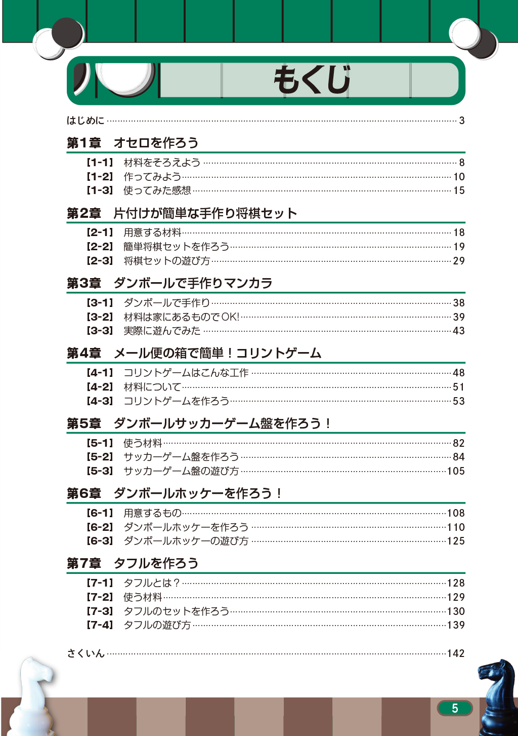 本書では、ダンボールやティッシュ箱などおうちにあるものでボードゲームを作るレシピを紹介。将棋やオセロといった定番ゲームから、ホッケー、サッカー盤、コリントゲーム(ピンボールゲーム)のような複雑な仕組みのゲームまで、様々なゲームの作り方を紹介します。 微妙な長さの休みを、手軽に作れるボードゲームで楽しみましょう!