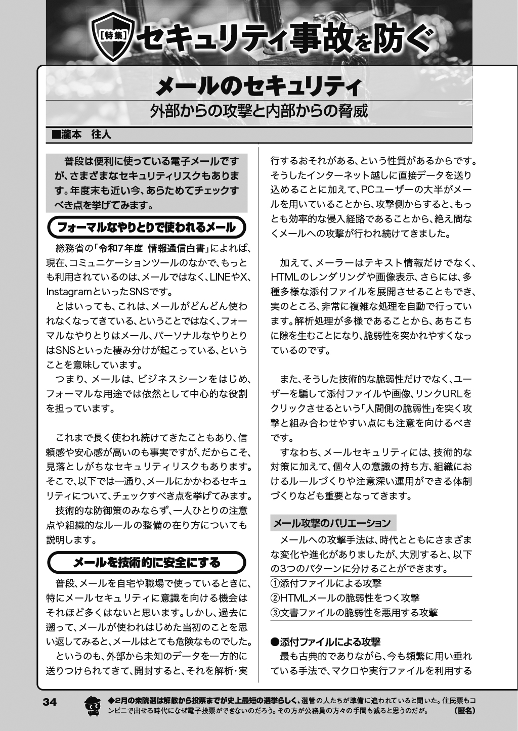 人や物の出入りが多くなる年度末・年度初めには、様々な問題が起こります。セキュリティ絡みの問題もその1つ。「誤ってデータを充分消さないままPCを廃棄してしまった」「退職者のアカウントが社内情報を閲覧できる状態で放置されていた」といった事件は、まま聞くものです。 本特集では、このようなセキュリティ事故を防ぐための方法を紹介。不要アカウントを放置するリスクやパスワードの使い回しが招く情報漏洩の危険などについて説明した上で、メールのセキュリティ問題やクラウドサービス利用時の注意点、社内外に情報を持ち出すときや端末の譲渡時に気を付けることなど、セキュリティ事故を防止するための方策やマインドセットを解説します。