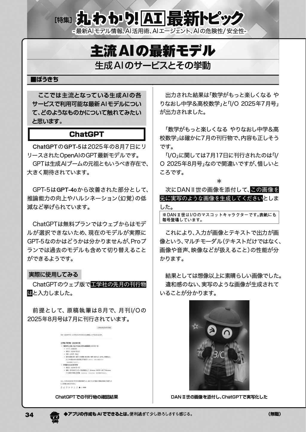 少し前までAI関係でもマニアックな領域の用語だったAIエージェントやローカル生成AIなどの言葉ですが、昨今は一般向けのAIサービスでも見るようになりました。「Grok 4」や「GPT-5」などの各AIモデルの最新版も発表され、相変わらずAI技術の進歩・普及は目覚ましいものがあります。 一方、国会ではAI法案の審議が進んでおりAIと社会の関係も刻々と変化しています。 本特集ではこういった続々と登場するAI関係の新トピックやAIの危険性/ 安全性について解説。 これらのAIを使いこなすための最新AI活用術についても紹介します。